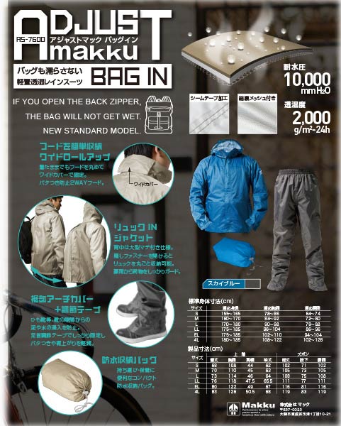 AS-7600 アジャストマックバッグイン バッグも濡れない軽量レイン。 フードを簡単収納ワイドロールアップ。 防水収納バック入り。 商品明細 【素材】ポリエステル100% 【サイズ】M・L・LL 色/カーキー・スカイブルー 購入サイト AS-7600 |