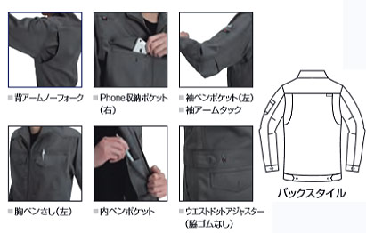@.携帯電話収納ポケット(右胸)、A.内ペンポケット、B.背アームノーフォーク、