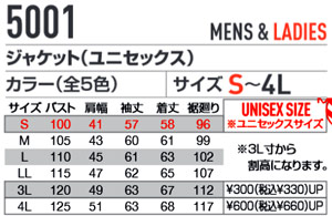 秋冬 5001ジャケット 5002カーゴパンツ 春夏対応商品≫≫5011シリーズ 商品番号