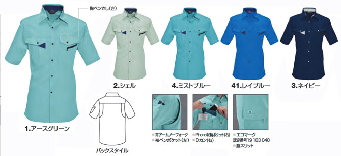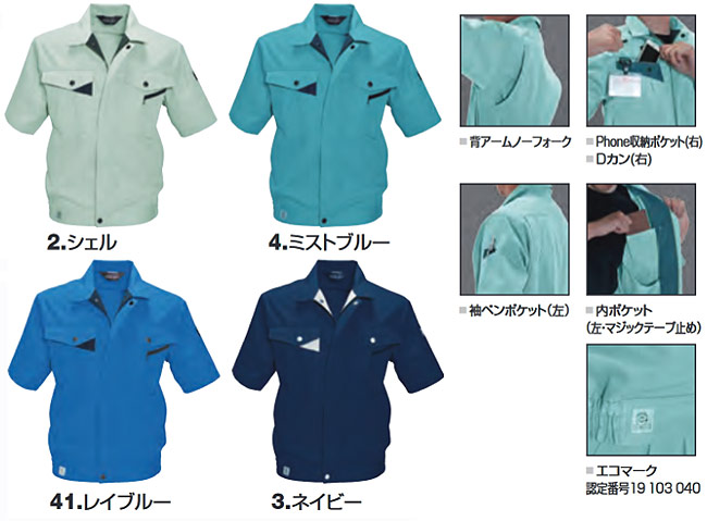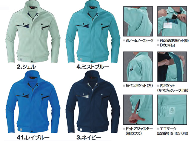 春夏バートル 混率/ポリエステル65% ・ 綿35%(リサイクル素材65%使用) カラー/ 2.シェル 1.アースグリーン 4.ミストブルー 41.レイブルー 3.ネイビー 購入サイト 70-88 91-100 105-115 |