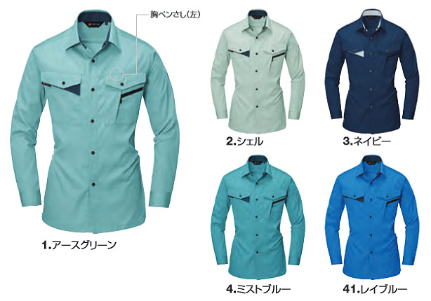 春夏四季バートル6023長袖シャツ 素材/エコライトチノ、制電ケア設計混率/ポリエステル65% ・ 綿35%(リサイクル素材65%使用) カラー/ 2.シェル 1.アースグリーン 4.ミストブルー 41.レイブルー 3.ネイビー サイズ/ S-LL、 3L 4L 5L |
