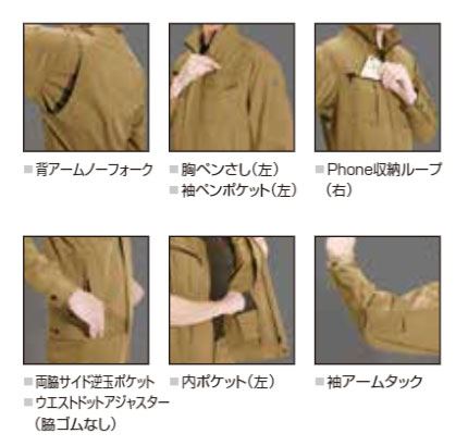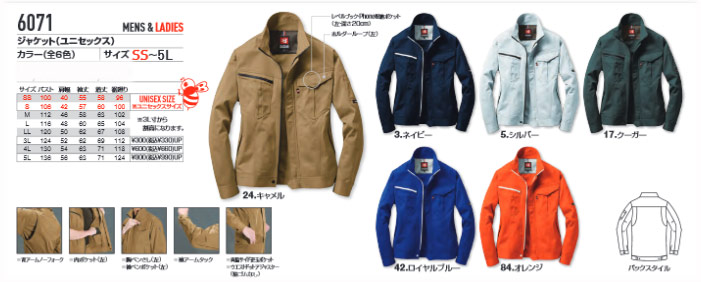 素材/T/Cソフトツイル、制電ケア設計 混率/ポリエステル65% ・ 綿35% カラー(全6色) クーガー、キャメル、シルバー、ネイビー ロイヤルブルー、オレンジ サイズ/ SS−5L 1.背アームノーフォーク 2.袖アームタック 3.ウエストスリットアジャスター(脇ゴムなし) 4.携帯電話収納ポケット(右腕) 5.内ポケット(左) 6.袖ペンポケット(左) 7.両脇逆玉ポケット 8.胸ペンさし(左) 購入サイト SS-LL 、3L 4L 5L |