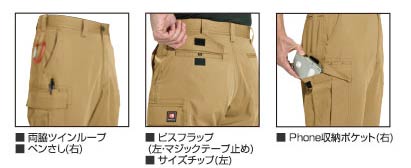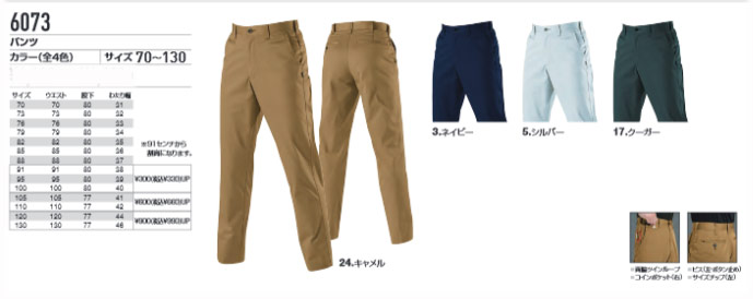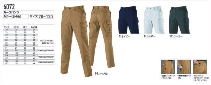 バートル 6079レディースパンツ 素材/ソフトツイル、帯電防止 混率/ポリエステル65%・綿35% 色/ クーガー、キャメル、シルバー、ネイビー サイズ/ S-4L 1.脇シャーリングゴム仕様 2.サイズチップ(左) 3..ビフフラップ(左・ボタン止め) 購入サイト S〜LL 、3L 4L |
