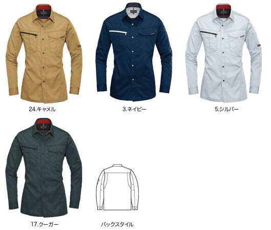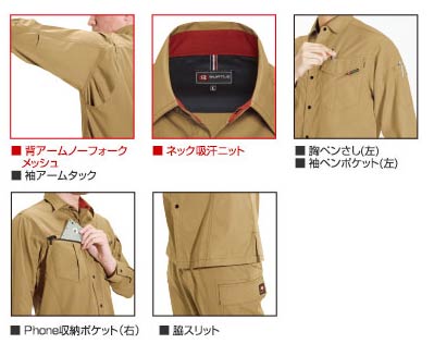 素材/T/Cライトチノ、制電ケア設計 混率/ポリエステル65% ・ 綿35% カラー(全4色) クーガー、キャメル、シルバー、ネイビー サイズ/ S−5L 1.背アームノーフォーク 2.袖アームタック 3.衿吸汗ニット 4.脇スリット 5.携帯電話収納ポケット(右腕) 6.袖ペンポケット(左) 購入サイト S-LL 、3L 4L 5L |
