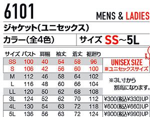 6101ジャケット 夏冬6103長袖シャツ 6106カーゴパンツ 6107ユニセックスパンツ 6109レデーィスカーゴパンツ 商品番号