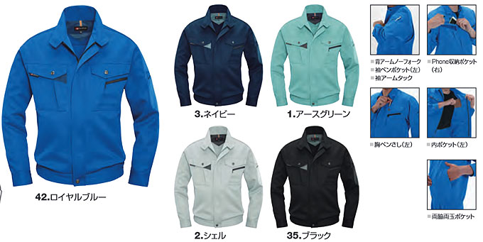 素材/高密度ストレッチツイル、 スーパー撥水加工、制電 混率/ポリエステル100% 色/ アースグリーン、ネイビー、シェル、 ロイヤルブルー、ブラック サイズ/ S−5L @.背アームノーフォーク A.袖アームタック B.携帯電話収納ポケット(右胸) C.内ポケット(左) E.両脇両玉ポケット 注文サイト S-LL 3L 4L 5L |