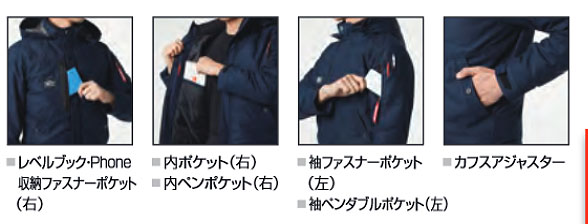 ・ 素材/表地:高密度アーミーサテン、強撥水加工・ 裏地:アルミメッシュラミネート加工(保湿性)