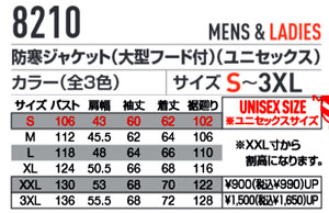 ・冬バートル 8210防寒ジャケット 8212防寒カーゴパンツ 商品番号 TOP・