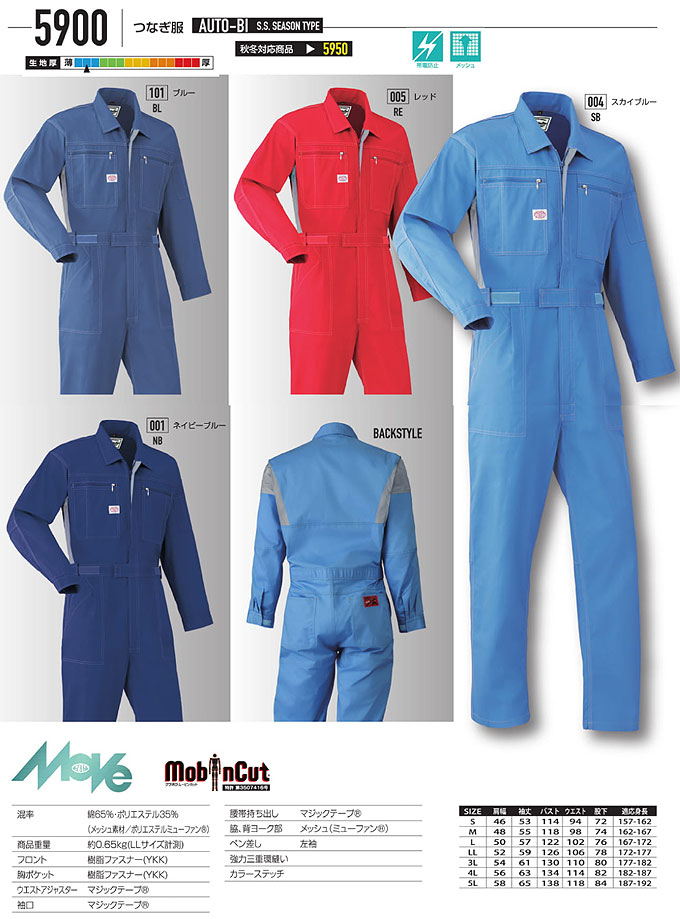 s.s.season type 春夏山田辰 5900長袖つなぎ服 混率/綿65%・ポリエステル35% (メッシュ素材/ポリエステル100%) 商品重量 約0.65kg(LLサイズ計測) 色:スカイブルー(SB)・レッド(RD)・ネイビーブルー(NB) ブルー(BL) 特長/クラボウムービンカット 脇・背部分メッシュ入り 強力三重環縫 帯電防止織物使用 日本製生地使用 YKKファスナー使用 3L以上は価格が変わります。 購入サイト S-LL 3L 4L・5L |