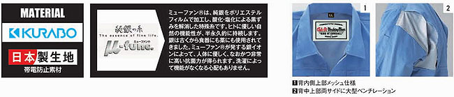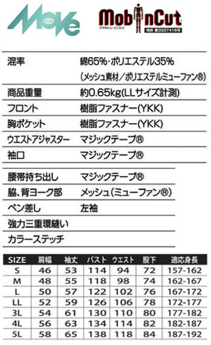 | MobinCut クラボームービンカットは作業中の人体の動きを人間工学に基づいて 3Dカッティングした商品です。 背面肩部と脚部に新たなカットを入れることにより、腕と脚の動きに対して おこる引きつりを軽減する「ムービンカット」を採用したユニフォーム #5900が好評! これからの季節には最適のメッシュ素材を内部や脇部などに採用し 着用時の爽やかさをトップレベルで実現。さらに背部肩部には衣服内の 湿った空気を外に押し出し、外部の空気を取り入れるのに最適な 大型ベンチれージョンを採用。ウエストのサイズを自由に調節できる マジックテープなど、機能性も充実。 |