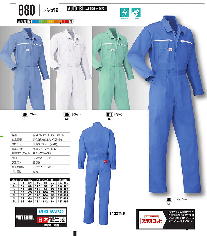 ALL.SEASON TYPE オートバイ印 四季山田辰 880長袖つなぎ服 特長/日清紡・エコディオナ使用、 帯電防止織物使用、日本製生地使用、 YKKファスナー使用 生地の厚み 12/15 商品重量 約0.5kg (LLサイズ計測) 素材/綿70%・ポリエステル30% 色/007.スカイブルー、009.ホワイト、 007.グレー、010.グリーン サイズ/S−5L ※3Lより価格が変わります。 購入サイト S−LL 3L 4L−5L |